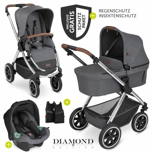 Der Kombi-Kinderwagen Samba – inkl. Babywanne und Sportsitz – Diamond Edition in Asphalt von ABC Design ist ein sehr gut ausgestatteter Allrounder auf 4 Rädern. Er ist superleicht und bietet durch seine All-Terrain Bereifung mit Luftkammerrädern ein sehr breites Einsatzspektrum. Dank des extrem kleinen Faltmaßes bekommst Du ihn auch in einen kleinen Kofferraum. Im Vergleich zu den anderen Modellen von ABC Design musst Du hierzu nicht mal den Sportwagen-Aufsatz abnehmen. Trotzdem bietet er den gleichen Komfort wie die anderen Modelle.
