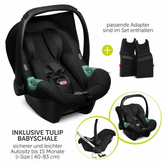 - 3-IN-1 KOMPLETTSET: ab der Geburt bis ins Kleinkindalter alles dabei: leichtes Aluminium-Gestell + Babywanne mit Matratze für Neugeborene + i-Size Autositz Tulip Black und Adapter + Sportwagen-Aufsatz (Buggy) für Kleinkinder + Zubehörset.