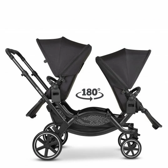 Der Geschwisterwagen Zoom inkl. 2 Sportsitzen – Classic Edition – Ink von ABC Design ist der perfekte Wagen für Zwillinge und Geschwister mit geringem Altersunterschied. Neben einer variablen Blickrichtung gibt es auch verschieden Aufsatz-Möglichkeiten: Beide Plätze kannst Du beliebig mit Sportsitzen, Babyschalen oder Babywannen verwenden. Außerdem punktet der Zoom mit ausklappbaren Verdecken, großen Luftkammerrädern und einem Klick-System für Zubehör am höhenverstellbaren Schieber.