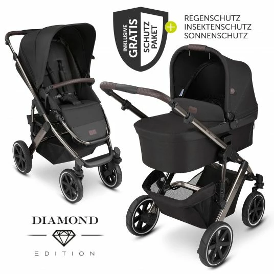 - NEU – DIAMOND EDITION: Jetzt mit noch besser belüfteter Babywanne mit zweitem Belüftungsfenster & extra weicher Babywannen-Matratze mit Schutzrand – kombiniert mit exklusiven Stoffen und edler Lederoptik an Schiebegriff und Schutzbügel.