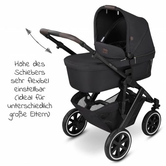 Black is beautiful: Keine andere Farbe trägt so viel Eleganz und Tiefe in sich.Das hochwertige Aluminium-Gestell überzeugt im edlen und markanten mattschwarzen Look. Zusammen mit den schicken Reifen mit weißer Kontrastlinie entsteht eine stilvolle Silhouette. Der beige Innenstoff der Babywanne und der tiefschwarze „midnight“ Außenstoff bilden eine kraftvolle Farbkombination.