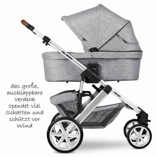Bestens untergebracht geht es auf Tour. Dabei hat der Salsa 4 auch für Eltern ein paar Highlights. Der Schieber ist höhenverstellbar und ermöglicht Mama und Papa Spazierfahrten in bequemer Körperhaltung. Der Salsa ist auch für sehr große Eltern geeignet, da er zwischen den Hinterrädern enorm viel Beinfreiheit bietet. Noch mehr Erleichterung im Alltag bietet der super geräumige Einkaufskorb. Hier kannst Du sperrige und schwere Sachen unterbringen und sparst so Kraft und Nerven.