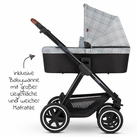 - Ausstattung: Babywanne mit Matratze und großem Sonnenverdeck, Sportwagensitz mit flacher Liegeposition, ausklappbarem Verdeck, gepolstertem 5-Punkt-Gurt, abnehmbarem Schutzbügel, kugelgelagerte und pannensichere All-Terrain Luftkammerräder, zentrale Federung, höhenverstellbarer Schieber