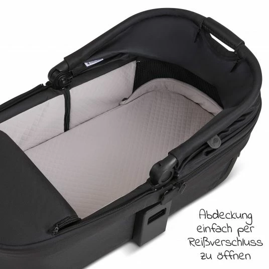 Die extra große Babywanne ist mit einer ergonomischen Overnight-Matratze ausgestattet und bettet Dein Neugeborenes weich und bequem. Luftlöcher im Schaumstoff der Matratze garantieren eine angenehme Belüftung. Am Kopfende schützt die Keilform das kleine Köpfchen und lagert es hoch. Geschützt wird es in der Wanne von der passenden Abdeckung und einem großen Verdeck.