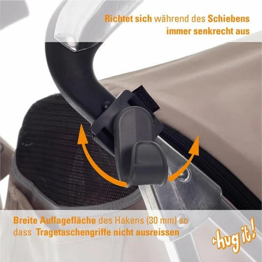 Die Haken haben eine breite Auflagefläche. So reißen selbst gut gefüllte Einkaufstaschen nicht ein. Ein weiteres Plus: Dank der innovativen Befestigung hängt der Haken HUG IT! während des Schiebens immer senkrecht nach unten – damit fällt auch beim Bergauf- oder Bergab-Schieben nichts aus der befestigten Tasche heraus.