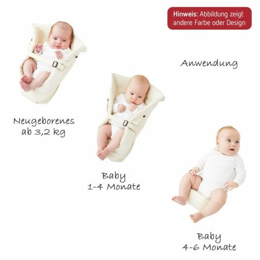 The Easy Snug newborn insert is suitable from birth (3.2 kg) up to a body weight of 5.5 kg and is quickly and easily attached to the stretcher with straps. Compared to the previous model, thicker cotton fabric was removed from the RΓΌcken panel to reduce heat formation. As soon as your child can hold his or her own child, you can carry him or her without any effort.