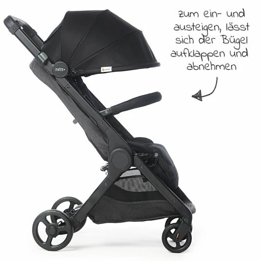 Der Metro+ hat einen durchgehenden Schiebegriff und ermöglicht so auch einhändiges Manövrieren. Mit schmalen, leichtgängigen und pannenfreie Räder aus PU (Polyurethan). Die schwenkbaren Vorderräder kommen um jede Kurve. Die Federung gleicht kleine Unebenheiten spielend leicht aus. So wird jede Bordsteinkante zum Kinderspiel. Die leicht zu bedienende One-Touch Fußbremse stoppt den Wagen sicher.