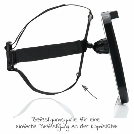 Der Spiegel wird ganz einfach an einer Kopfstütze der Rückbank so angebracht, dass sich Dein Baby darin spiegelt. Dazu legst Du die beiden Befestigungsgurte um die Kopfstütze und ziehst sie fest an. Richte den Spiegel so aus, dass Du ihn vorne über den autoeigenen Rückspiegel sehen kannst. Mit dem praktischen 360° Kugelgelenk ist die Einstellung recht einfach.