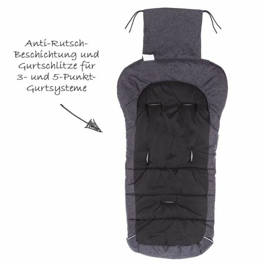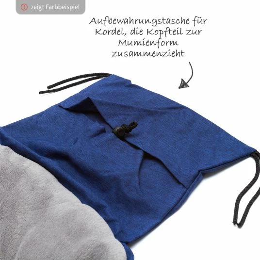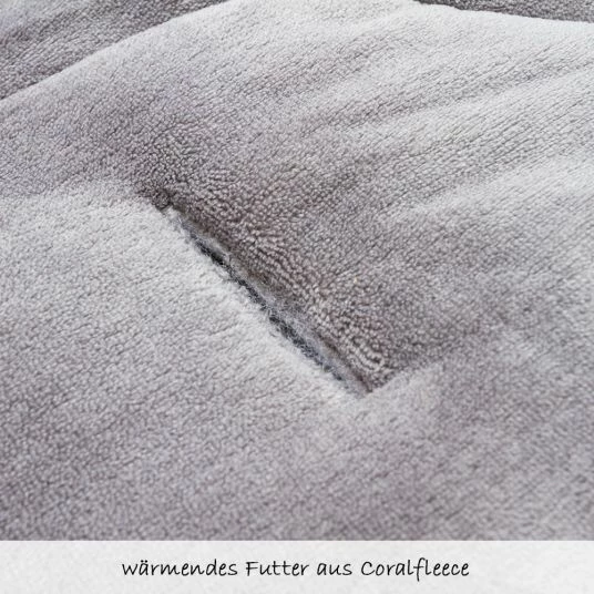 Thanks to the 2 long, lateral and the single central belt slot, the footmuff is suitable for both 3-point and 5-point belts. The foot part can be opened. So you can put your little one even easier in the stroller and the inside of the footmuff won’t come into contact with dirty shoes. The head area can be pulled together with help a cord to form a mummy – so your offspring will have even more cuddly.