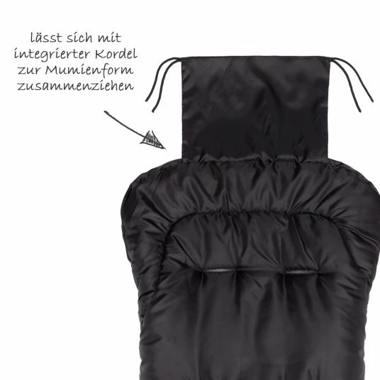 Der wattierte Fußsack hält wohlig warm und ist dabei dank seines Futters aus Polarfleece extra weich und angenehm leicht. Das Außenmaterial aus Polyester wirkt zusätzlich wasserabweisend. Der Kopfbereich lässt sich mit einer Kordel zur Mumienform zusammenziehen und schützt so besonders gut vor Kälte, Zugluft und anderen Witterungseinflüssen. Die Kordel lässt sich in einer praktischen Aufbewahrungstasche auf der Rückseite verstauen.