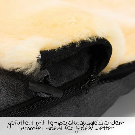 Der Fußsack Makalu – Melange Dunkelgrau ist gefüttert mit kuschelig warmem Lammfell. Er ist so geschnitten, dass er perfekt in Kinderwagen mit abgewinkeltem Sitzteil (z.B. Moon, Bugaboo, Joolz) passt. Weil Lammfell wärmeregulierend wirkt und Feuchtigkeit verdunstet, macht der Fußsack Makalu bei jedem Wetter eine gute Figur. An kalten Tagen wärmt er, an heißen Tagen wirkt er temperaturausgleichend. Das Lammfell ist zertifiziert nach Ökotex-Standard 100.
