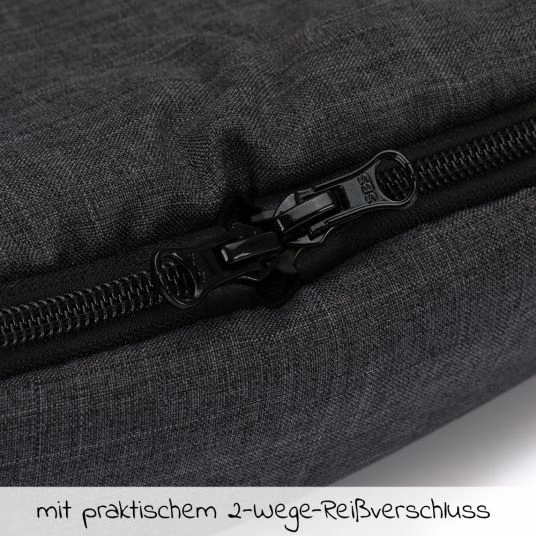 Dank seiner langen Gurtschlitze kannst Du den Fußsack problemlos am Wagen befestigen. Das Oberteil lässt sich sowohl in der Mitte als auch seitlich mittels Reißverschluss öffnen. Du kannst es auch komplett entfernen und so das Rückenteil als wohlig-weiche Sitzunterlage verwenden. Das Außenmaterial aus Polyester-Pongee wirkt wasserabweisend. So kann auch leichter Regen dem Fußsack nichts anhaben.