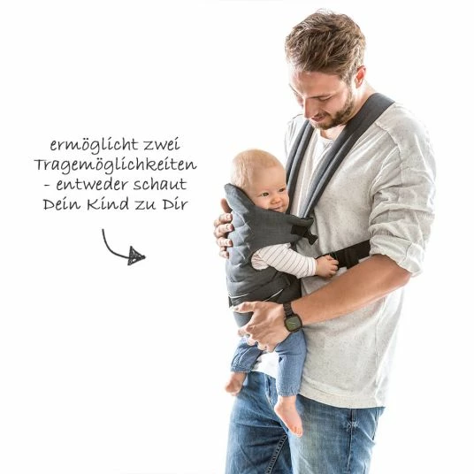 So she promises beautiful cuddling moments with your baby. A safe and comfortable baby sling, in which you can carry your child ergonomically correctly and at the same time protect your child. Whether at home or on the road, the 2 Way Carrier makes it easy to carry in two ways. The many adjustment possibilities and the reinforced head and back sections promote the correct posture and offer a high level of wearing comfort. In this cuddly baby sling your child feels comfortable and secure all around. It can always feel you, your warmth, your breathing, your heartbeat. At the beginning you carry your little one with your face turned towards you, later it looks forward and may curiously explore its surroundings.