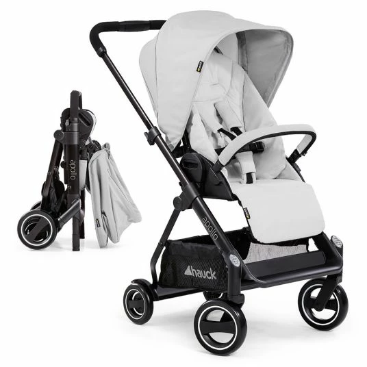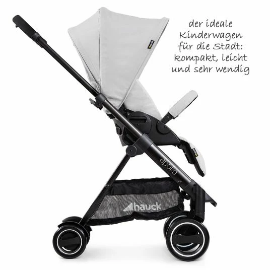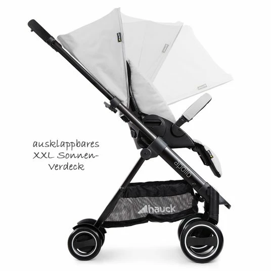 Der Sportwagen Apollo von Hauck ist perfekt auf das schnelle Stadtleben abgestimmt. Die bequeme Sitzeinheit stellst Du mit nur einer Hand schnell von aufrechter Sitz- in eine flache Liegeposition. So kann Dein Kleines ein verdientes Nickerchen halten. Das groรe, ausziehbare Verdeck schรผtzt dabei vor Sonne, Wind und Lรคrm. Die mitgelieferte Beindecke sorgt fรผr Wรคrme an kalten Tagen. Der Sitz ist weich gepolstert und trรคgt Kinder bis 25 kg. So begleitet der Buggy euch รผber einen extra langen Zeitraum. Super: Die leichte Sitzeinheit kann einfach abgenommen und umgesetzt werden. Anfangs blickt Dein Kleines so zu Mama und Papa. Spรคter gucken neugierige Entdecker nach vorne, den Weg bestens im Blick. Ein gepolsterter 5-Punkt-Gurt hรคlt Deinen Schatz fest im Sitz. Zusรคtzliche Sicherheit bietet der Schutzbรผgel. Um Dir das Reinsetzen zu erleichtern, ist er einfach abnehmbar. Auch der groรe Korb hilft Dir im Alltag: Einkรคufe und Baby-Sachen kannst Du hier bequem ablegen.