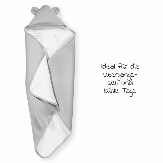 Besonders in der Γbergangszeit ist es an manchen Tagen noch sehr kΓΌhl und das Wetter kann schnell wechseln. Die kuschelige Hauck Einschlagdecke / Kuscheldecke Snuggle N Dream in Grey aus hautfreundlichem Baumwolljersey dient dabei als angenehmer WΓ€rmespender. Dabei ist das wΓ€rmende Material atmungsaktiv und feuchtigkeitsregulierend, so dass Dein Spatz nicht so leicht ins Schwitzen kommt. Die putzige Kapuze mit zwei Γhrchen schΓΌtzt den Babykopf vor Zugluft.