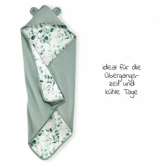 Besonders in der Übergangszeit ist es an manchen Tagen noch sehr kühl und das Wetter kann schnell wechseln. Die kuschelige Hauck Einschlagdecke / Kuscheldecke Snuggle N Dream in Leaves Mint aus hautfreundlichem Baumwolljersey dient dabei als angenehmer Wärmespender. Dabei ist das wärmende Material atmungsaktiv und feuchtigkeitsregulierend, so dass Dein Spatz nicht so leicht ins Schwitzen kommt. Die putzige Kapuze mit zwei Öhrchen schützt den Babykopf vor Zugluft.
