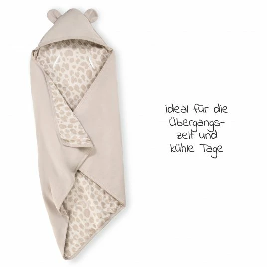 Besonders in der Übergangszeit ist es an manchen Tagen noch sehr kühl und das Wetter kann schnell wechseln. Die kuschelige Hauck Einschlagdecke / Kuscheldecke Snuggle N Dream in Leo Natural aus hautfreundlichem Baumwolljersey dient dabei als angenehmer Wärmespender. Dabei ist das wärmende Material atmungsaktiv und feuchtigkeitsregulierend, so dass Dein Spatz nicht so leicht ins Schwitzen kommt. Die putzige Kapuze mit zwei Öhrchen schützt den Babykopf vor Zugluft.