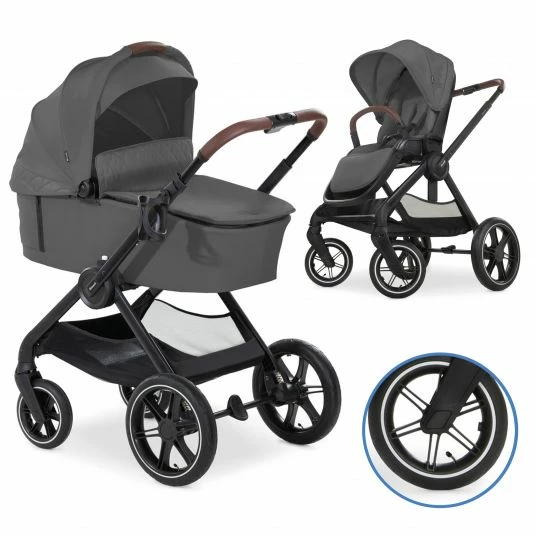 Hochwertig, komfortabel und noch wendiger auf jedem Untergrund – den Hauck Kombi-Kinderwagen Walk N Care Air Set in Dark Grey nutzt Du erst mit der Babywanne und später mit dem Komfortsitz. So ist der Kinderwagen ab der Geburt bis ca. 4 Jahre geeignet und bis 25 kg belastbar (22 kg Kind + 3 kg im Korb). Dank robustem, leichtem Aluminiumgestell, der 4-fach-Federung und den großen Luftreifen fährst Du überall komfortabel und pannensicher. Das Premium-Design überzeugt durch langlebige, pflegeleichte Stoffe mit UV-Sonnenschutz 50+ sowie Bügel und Griff in Lederoptik.