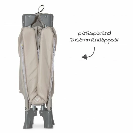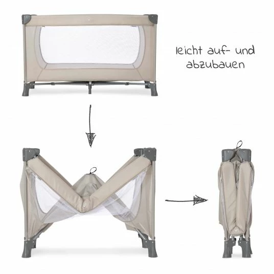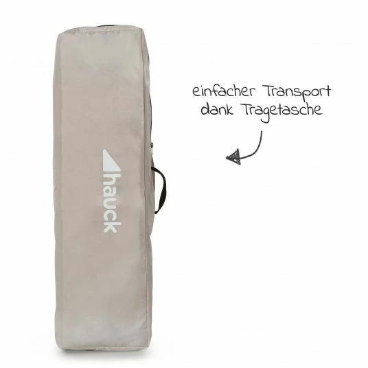 Das Hauck Reisebett ist mit ein paar wenigen Handgriffen schnell aufgebaut und wieder zusammengeklappt. Die beiliegende Faltmatratze ist mit PU-Schaum gefΓΌllt und dient als Einlegeboden und Stabilisator.