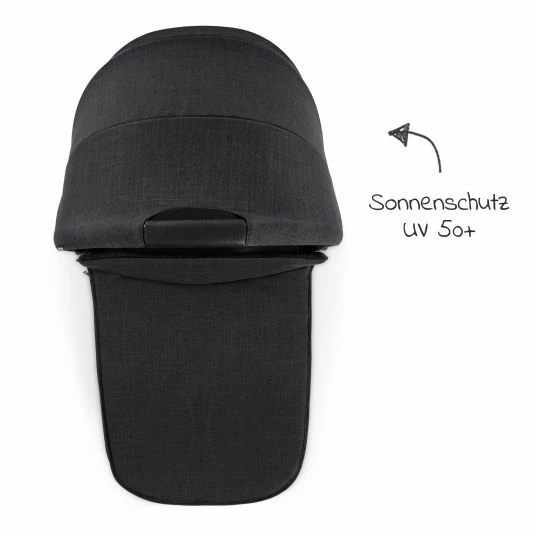 Damit der Nachwuchs bei jedem Wetter geschützt ist, bietet das extra große Verdeck einen UV-Schutz 50 + und eine ausklappbare Sonnenblende. An wärmeren Tagen können zusätzlich zwei große XXL Panoramafenster geöffnet werden. Auf diese Weise bleibt die Luft unter dem Verdeck angenehm und es kann kein Wärmestau entstehen.