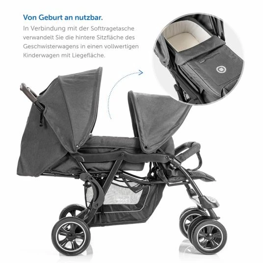 Der Hoco Tandem Geschwisterwagen bietet viel Komfort fรผr Dich und Deine Kinder. Er ist leicht, kompakt und platzsparend, ohne an Sicherheit einzubรผรen. Die beiden hintereinander angeordneten Sitzeinheiten eignen sich fรผr Kinder unterschiedlichen Alters oder Zwillingskinder ab dem Sitzalter (ca. 6 Monate). Mit seinen 13 kg Eigengewicht gehรถrt er zu den Leichtgewichten unter den Tandem-Kinderwagen und ist kaum breiter als ein gewรถhnlicher Kinderwagen.