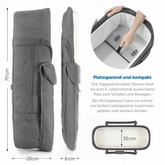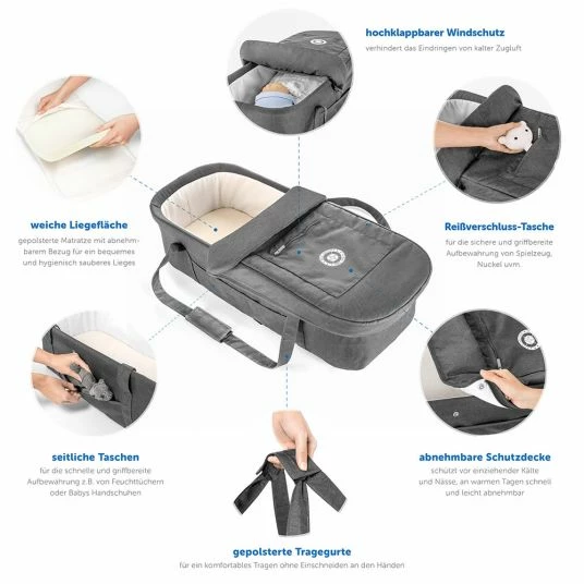 - Ausstattung: Tragetasche, gepolsterte Matratze mit waschbarem Bezug, Schutzdecke und Unterlage fรผr den spรคteren Gebrauch als Fuรsack,gepolsterte Tragegurte