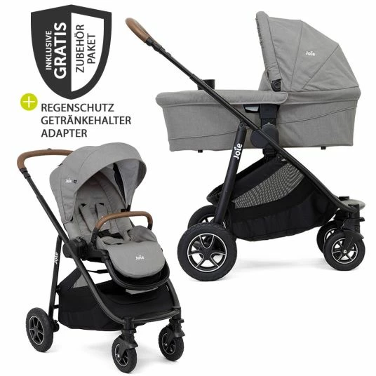 Mit dem 2in1 Kombi-Kinderwagen-Set Versatrax – Gray Flannel mit Babywanne Ramble XL, Getränkehalter, Regenschutz & Adapter kommt Joie dem perfekten Kinderwagen noch ein Stück näher. Der robuste Allrounder überzeugt mit klassischen Ausstattungsmerkmalen, wie einer verstellbaren Rückenlehne, einem großen Verdeck und mitwachsendem 5-Punkt-Gurt mit SoftTouch-Polsterung. Mit den gummierten, Schaumstoffgefüllten Reifen mit Einzelfederung bist Du auf jedem Untergrund laufruhig unterwegs. Außerdem ist der Versatrax mit einem höhenverstellbaren Schieber mit einem Bezug aus Lederimitat ausgestattet. Praktisch: Mit der Babywanne Ramble XL kannst Du den Kinderwagen bereits ab der Geburt nutzen.