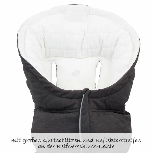 Dank des mittigen Reißverschlusses lässt sich der Fußsack komplett öffnen. In der Dämmerung sind der Fußsack und sein kleiner Passagier dank eingearbeiteter Reflektoren entlang des Reißverschlusses für Autofahrer gut zu sehen.