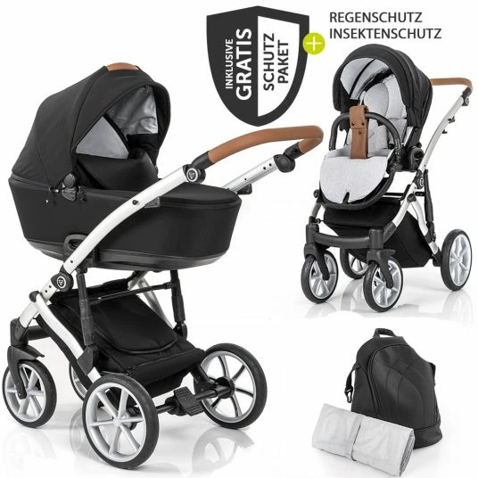 - Extras: inklusive Wickelrucksack mit Wickelunterlage, Beindecke für den Sportwagenaufsatz, Schutzdecke für die Wanne, Regenschutz für Wanne und Sportwagensitz, Insektenschutz für Wanne und Sportwagensitz, Becherhalter