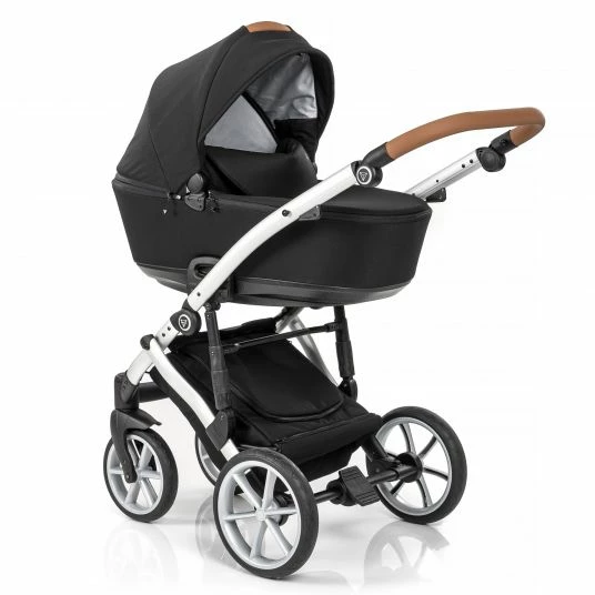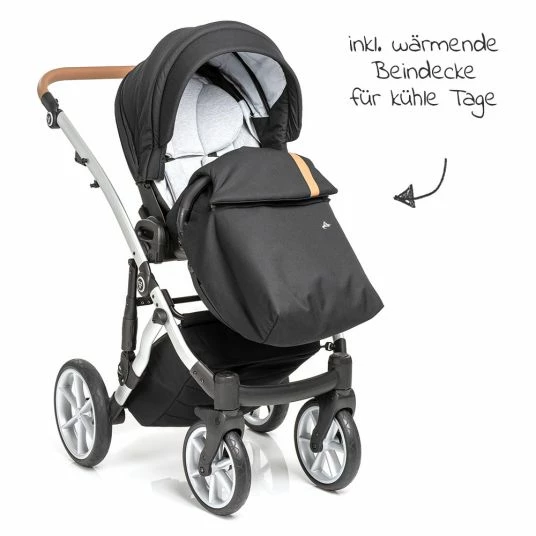 Das exklusiv bei uns erhältliche 2in1 Kombi-Kinderwagen-Set Space Schwarz von Junama zeichnet sich durch seine vielen Funktionen und jeder Menge Zubehör aus. Der Space präsentiert sich unter anderem mit outdoor-geeigneten Luftkammerrädern und einem höhenverstellbaren Schieber. Einen absoluten Blickfang stellen der schwarze Stoff, das weiße Aluminium-Gestell mit weißen Felgen sowie die schwarze Babywanne dar. Zum Kinderwagen gehört abgesehenen von der Babywanne noch einen Wickelrucksack, eine Beindecke und ein Regen- und Insektenschutz für Wanne und Sportsitz.