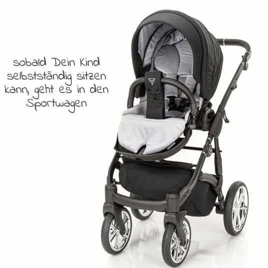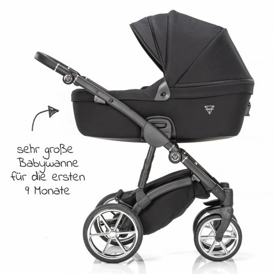 - Ausstattung: kugelgelagerte Luftkammerräder, schwenkbare & feststellbare Vorderräder, 5-fach höhenverstellbarer Schieber, 5-Punkt-Gurt, umsetzbare Sitzeinheit, 5-fach verstellbare Fußstütze, 4-fach verstellbare Rückenlehne, großes Verdeck mit Belüftungsöffnung & UV-Schutz 50+, abnehmbarer, aufklappbarer Frontbügel mit Durchrutsch-Schutz, Sitzauflage, Feststellbremse, Babywanne mit Belüftungssystem