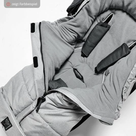 Der Thermo-Fleece Fußsack Pooly – Schwarz Melange von Kaiser schützt Deinen kleinen Schatz bei Wind und Wetter in Kinderwagen und Buggy. Das Außenmaterial ist wasserabweisend, im gepolsterten Inneren sorgt weicher Fleecestoff für Wärme und Kuschelkomfort. Dank der ABS-beschichteten Rückseite hält der Fußsack sicher im Kinderwagen. Zusätzlich kannst Du ihn mit Hilfe von Gummibändern an der Rückseite des Kinderwagengestells befestigen. An windigen Tagen ziehst Du das Kopfteil zusätzlich zu – so ist es im Fußsack besonders kuschelig.