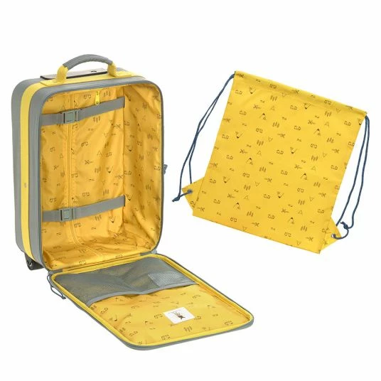 Der besondere Designclou heißt Pimp your bag! Mit drei mitgelieferten Textilstickern lässt sich der Koffer im trendigen Adventure Design nach Lust und Laune individuell gestalten. Kreativität und Gestaltungsfreude sind keine Grenzen gesetzt. Die Textilsticker lassen sich nach Belieben mehrmals ablösen und an einer neuen Stelle dekorieren. Warme Erdtöne und gelbe Farbakzente an Gurten und Griffen machen den Kinderkoffer zum echten Hingucker.