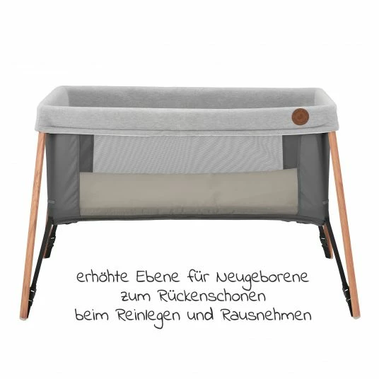 Da Du Dich nicht zu tief hinunterbeugen musst um es aus dem Bettchen zu nehmen, ist diese Höhe sehr rückenschonend. Ist Dein Kleines schon größer und kann selbstständig sitzen, wird es Zeit in die tiefere Position zu wechseln. Die hohen Seiten mit Netzstoff sind sehr luftig, geben jederzeit einen guten Blick auf Deinen Nachwuchs frei und verhindern, dass es einfach aus dem Maxi Cosi Reisebett Iris herausklettern kann.