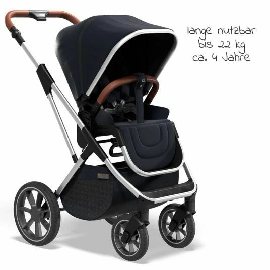 - Ausstattung: umsetzbare Sitzeinheit, weich gepolsterte Rückenlehne bis in Liegeposition verstellbar, gepolsterter mitwachsender 5-Punkt-Gurt, extra großes Verdeck mit Sichtfenster, UV-Schutz 50+, höhenverstellbarer Knickschieber, Gummiräder (29 cm), schwenkbare und feststellbare Vorderräder (19,5 cm), Feststellbremse, abnehmbarer, aufklappbarer Schutzbügel, großer Einkaufskorb