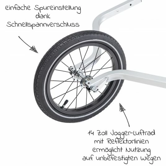 Bist Du mit Deinem Fahrradanhänger viel auf robusterem Gelände im Buggy- und Trailer-Modus unterwegs? Das luftgefüllte Queridoo 14″ Joggerrad für Einsitzer inkl. Deichselaufnahme eignet sich hervorragend zum Nachrüsten Deines Kidgoo oder Sportrex Anhängers. Dank des großen Luftrads kommst Du noch besser auf Feld- und Schotterwegen voran. Dein Nachwuchs sitzt während der Fahrt bequem im Buggy, ohne dabei von Hindernissen gestört zu werden.