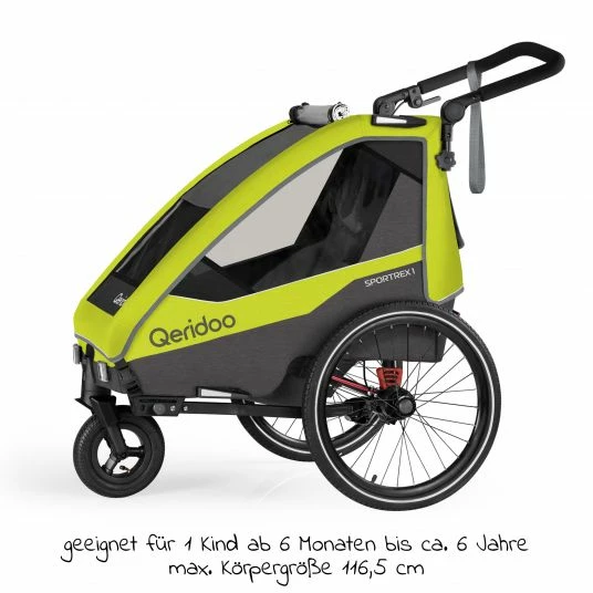 Du suchst einen sportlichen Fahrradanhänger für längere Touren und benötigst gleichzeitig einen sehr wendigen Kinderwagen? All das ist mit dem Queridoo Kinderfahrradanhänger & Buggy Sportrex für 1 Kind in Lime Green in der Limited Edition kein Problem. Bei Deinen täglichen Wegen und Ausflügen bist Du mit dem sportlichen Anhänger auf dem Fahrrad oder zu Fuß mit Deinem Nachwuchs besonders flexibel unterwegs. Mit der separat erhältlichen Babyschale oder Baby Hängematte kann der Queridoo Sportrex 1 bereits ab der Geburt genutzt werden.