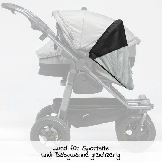 Der Sonnenschutz sitzt passgenau. Für einen guten Luftaustausch ist dabei stets gesorgt. Du kannst den Schutz ebenso lange einsetzen, wie Du Deinen Kinderwagen verwendest (36 Monate) – er passt sowohl über die Wannen als auch über die umgebauten Sportsitze. So ist auch der Spaziergang an sonnigen Tagen eine sichere Sache.