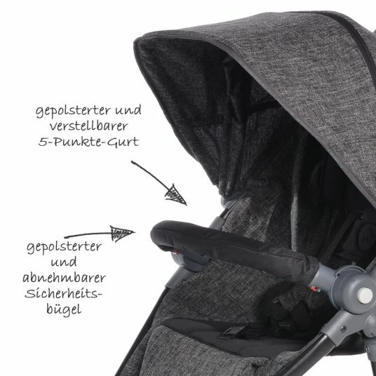 The seat is breathable and upholstered. With it your little one does not sweat so fast even in hot weather. The 5-point harness is height-adjustable to adapt even better to the size of your offspring. Getting in and out of the stroller is also easier, because you can not only adjust the height of the safety guard, but also remove it.