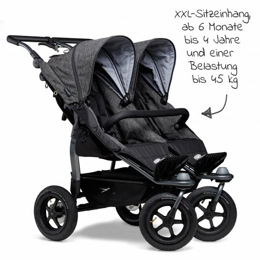 Der Geschwister- und Zwillings-Sport-Kinderwagen Duo – Premium Anthrazit mit 2 XXL-Sportsitzen ist die konsequente Weiterentwicklung der bewĂ€hrten TFK-Klassiker Twin Trail und Twin Adventure. Wie bei seinen VorgĂ€ngern werden auch hier QualitĂ€t und Sicherheit groĂgeschrieben.