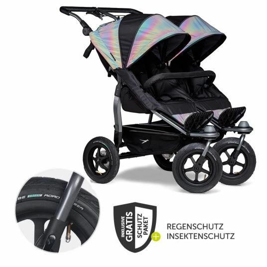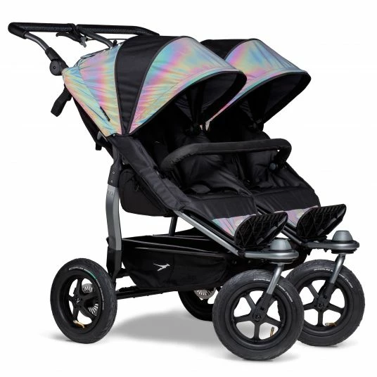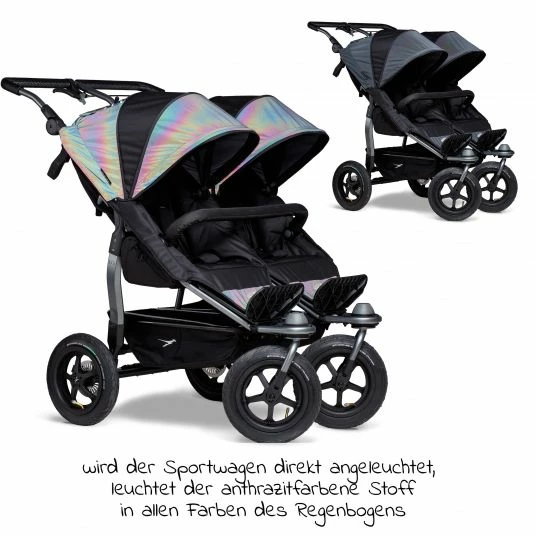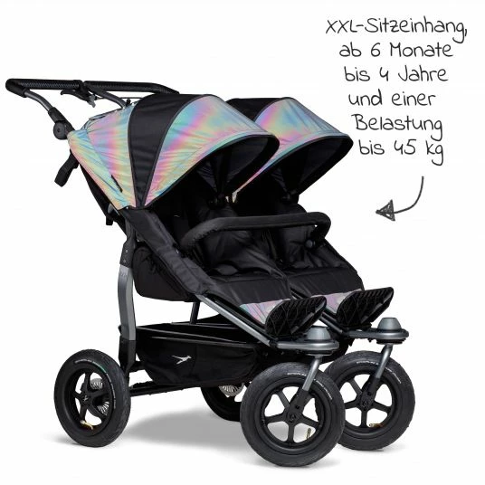 Der Geschwister- und Zwillings-Sport-Kinderwagen Duo – Glow in the Dark mit 2 XXL-Sportsitzen ist die konsequente Weiterentwicklung der bewährten TFK-Klassiker Twin Trail und Twin Adventure. Wie bei seinen Vorgängern werden auch hier Qualität und Sicherheit großgeschrieben.