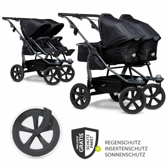 Der Geschwister- und Zwillings-Kombi-Kinderwagen Duo – Schwarz mit 2 Babywannen, die zu Sportsitzen umbaubar sind, ist die konsequente Weiterentwicklung der bewährten TFK-Klassiker Twin Trail und Twin Adventure. Wie bei seinen Vorgängern werden auch hier Qualität und Sicherheit großgeschrieben.