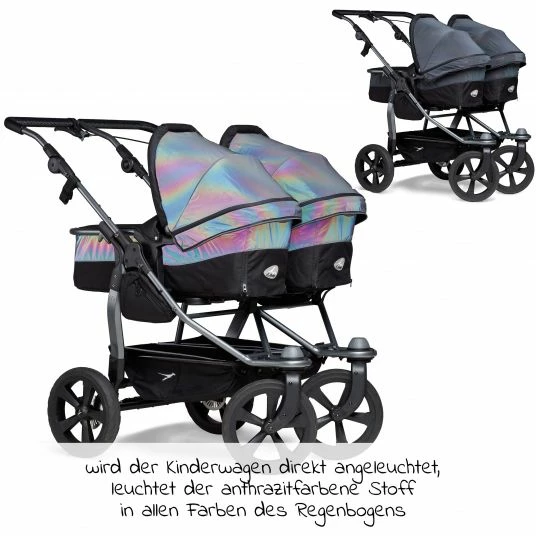 Unter normalem Lichteinfluss wirkt der Stoff anthrazitfarben. Wird der Kinderwagen direkt angeleuchtet, beispielsweise von Autoscheinwerfern, leuchtet er in allen Farben des Regenbogens. Das sieht nicht nur toll aus, sondern bietet bei schlechten Sichtverhältnissen mehr Sicherheit.