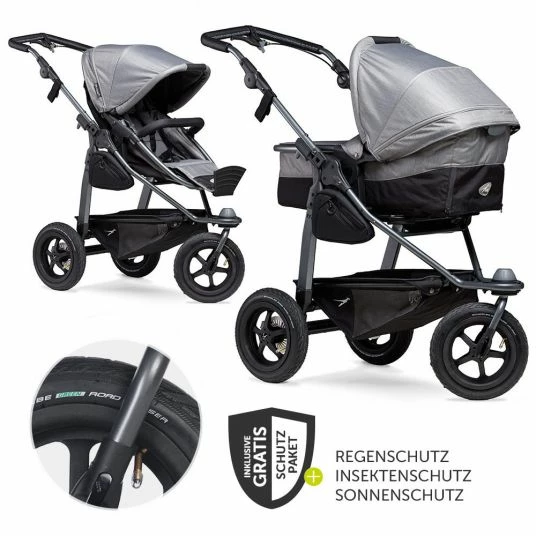 Der Kombi-Kinderwagen Mono mit zum Sportsitz umbaubarer Babywanne – Grau ist die konsequente Weiterentwicklung der bewährten TFK-Klassiker Trail und Adventure. Wie bei seinen Vorgängern werden auch hier Qualität und Sicherheit groß geschrieben.