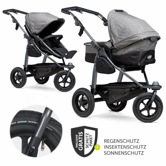 Mit gratis XXL-Zubehörpaket, das neben einem-Regenschutz für die Babywanne und einem Regenschutz für den Sportsitz auch noch ein Sonnensegel mit UV-Schutz 50+ und ein universal einsetzbares Insektenschutznetz von Zamboo enthält.
