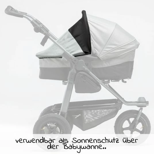 Der Sonnenschutz sitzt passgenau. Für einen guten Luftaustausch ist dabei stets gesorgt. Du kannst den Schutz ebenso lange einsetzen, wie Du Deinen Kinderwagen verwendest (36 Monate) – er passt sowohl über die Wanne als auch über den umgebauten Sportsitz. So ist auch der Spaziergang an sonnigen Tagen eine sichere Sache.