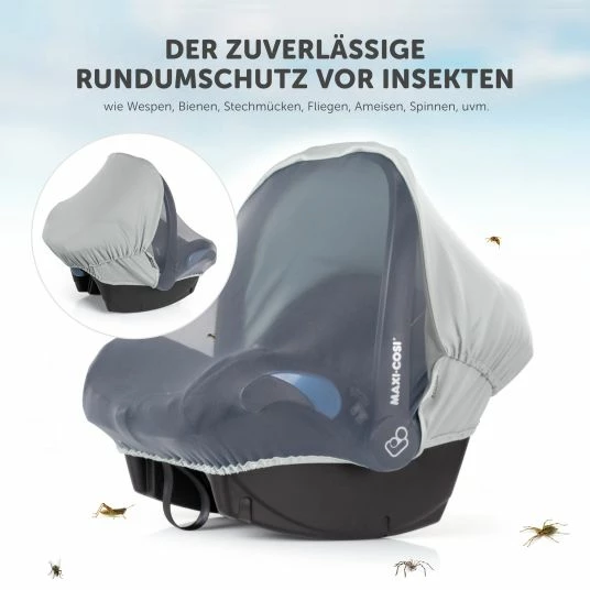 Der Moskitoschutz passt auf alle Babyschalen mit Tragebügel, z.B. Maxi Cosi Cabriofix, Citi, Rock, Pebble oder Modelle von ABC Design, Britax oder Kiddy. Er ist leicht anzubringen und lässt sich durch das elastische Material klein zusammenlegen. Wenn er mal schmutzig wird, kannst Du ihn bequem in der Maschine waschen.