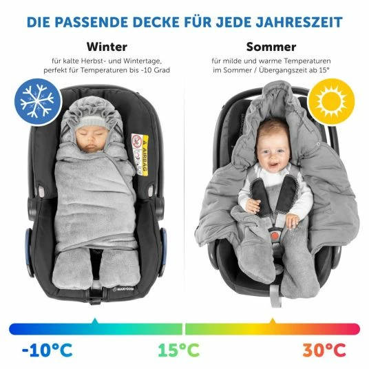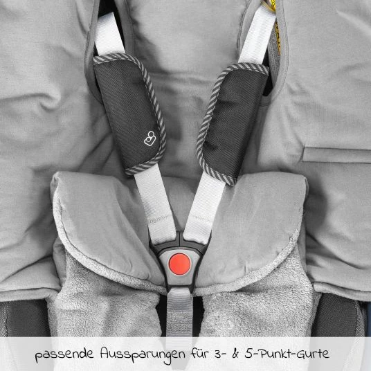 - eignet sich für viele Babyschalen dank aufknöpfbarer Öffnungen