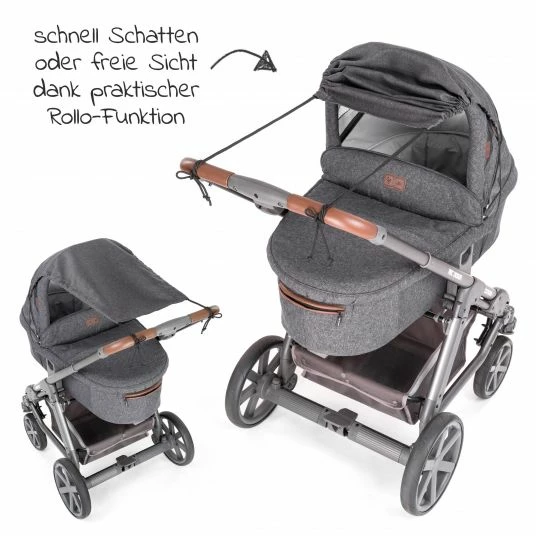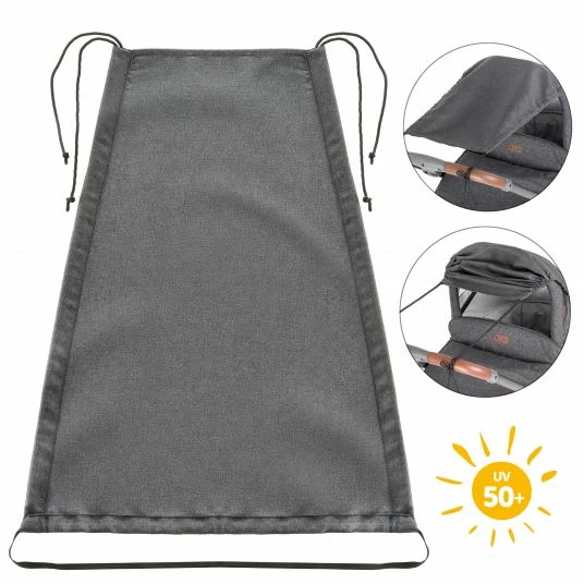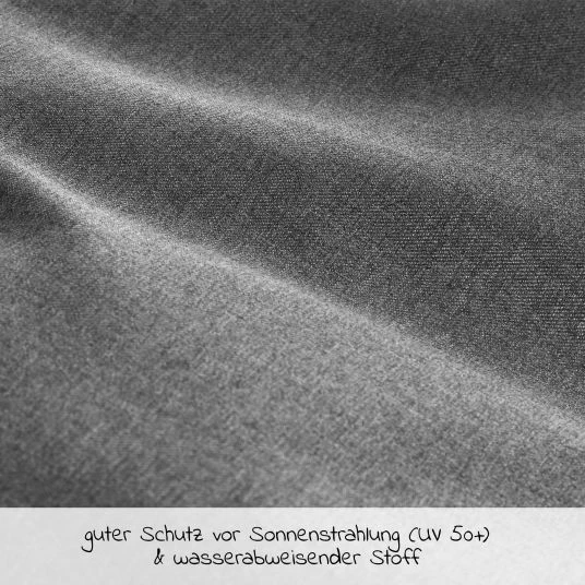 The baby awning is made of high quality and durable polyester twill fabric and is resistant to pulling and folding. The cool melange grey looks elegant and can be combined with almost all colours.
