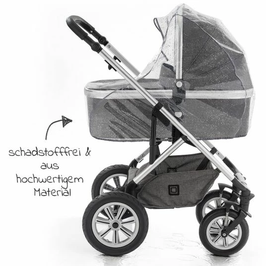 With Zamboo’s rain protection for baby carriages you protect your baby from the rain when walking. The transparent rain cover fits on all prams with baby tub or soft carrycot. With the help of the all-round rubber, it can be easily attached and removed again. The open window on the front provides sufficient fresh air. In addition, you will be able to reach your child better in this way, for example to give him his bottle. A small canopy over there protects even more reliably from raindrops. Thanks to the transparent film, your baby can still observe his environment and you always have a clear view of your offspring. The film complies with standard EN 71 and does not contain any plasticizers hazardous to health.